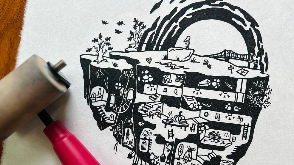Когда я довольна иллюстрацией, я переношу ее на гомубан, жесткий японский винил, который позволяет добиваться невероятных деталей при резке и нанесении чернил.