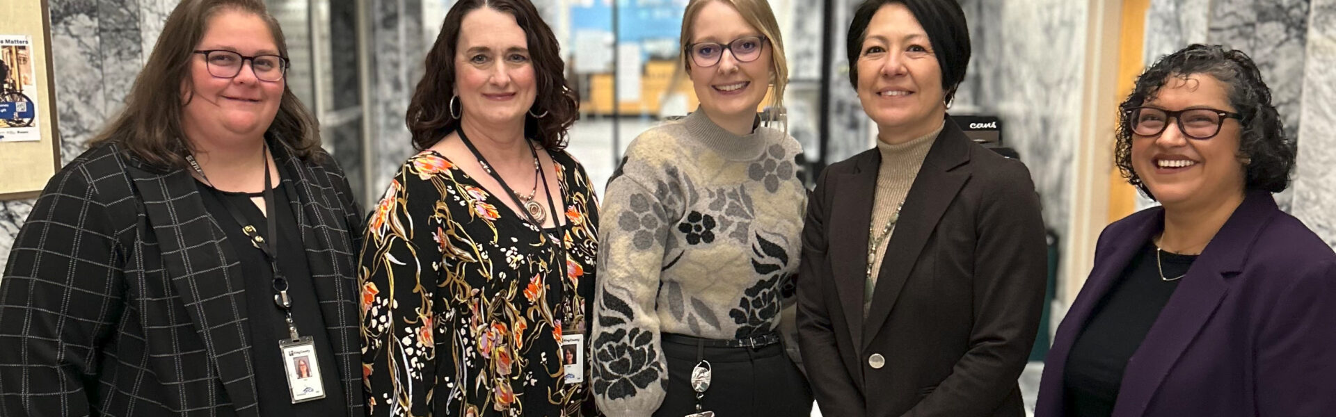 Лидеры Портала защиты приказы округа Кинг и сопутствующих программ, слева направо: Коллен Макингалл, Центр справедливости для детей округа Кинг; Шелл Хансингер де Энсисо,Advocate for Victims; Келси Гриир, Программа адвокатской поддержки приказы защиты; Лиса Мэньон, прокурор округа Кинг и Летисия Фигероа, Служба поддержки жертв.