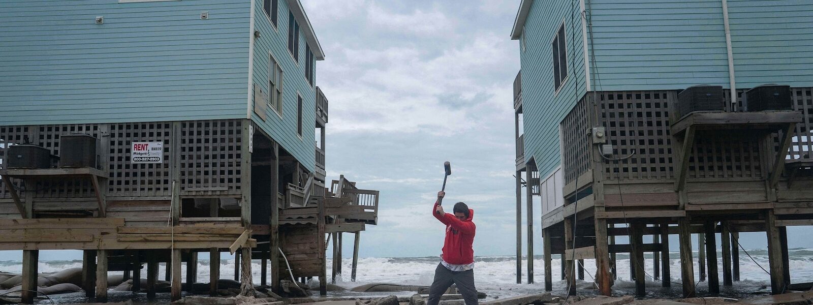 Джастин Хейс ломает бетон, который раньше составлял подъездную дорожку дома, построенного его компанией в прошлом году, чтобы его было легче вывезти, поскольку буря приближается в пятницу, 10 октября 2025 года, в Бакстоне, Северная Каролина.