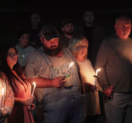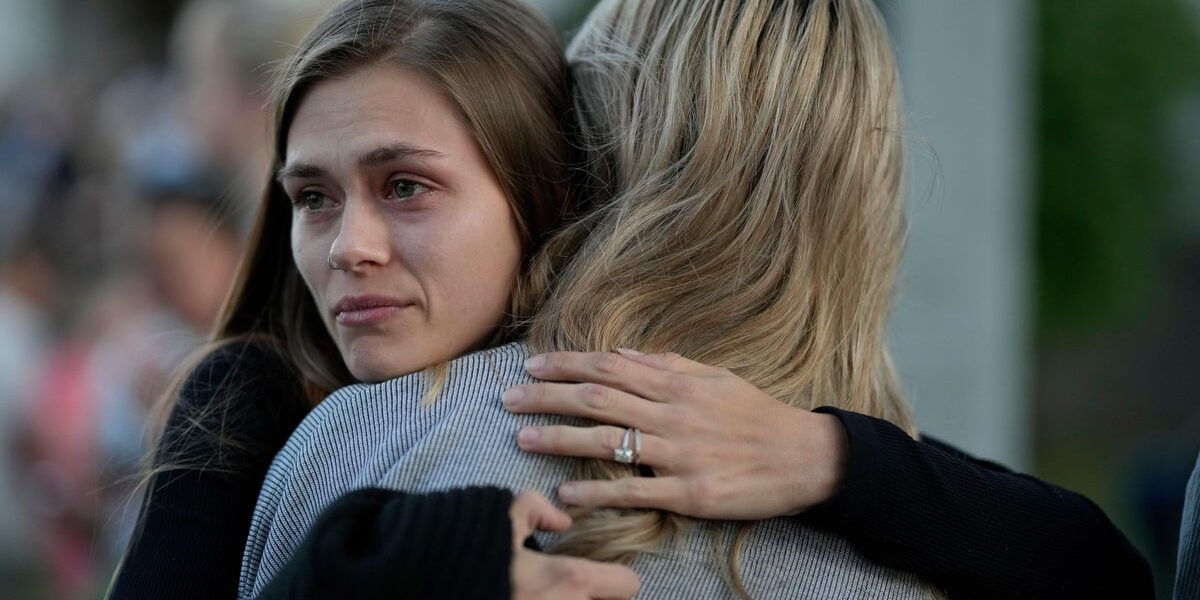 Кристен Линдси обнимает Мэдисон Брукс во время свечного бдения в честь жертв взрыва на заводе по производству взрывчатых веществ Accurate Energetic Systems в воскресенье, 12 октября 2025 года, в Уэйвли, Теннесси.