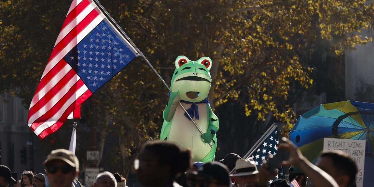Демонстратор в костюме жабы размахивал перевернутым американским флагом на протесте “Нет королям” в центре Лос-Анджелеса в субботу.
