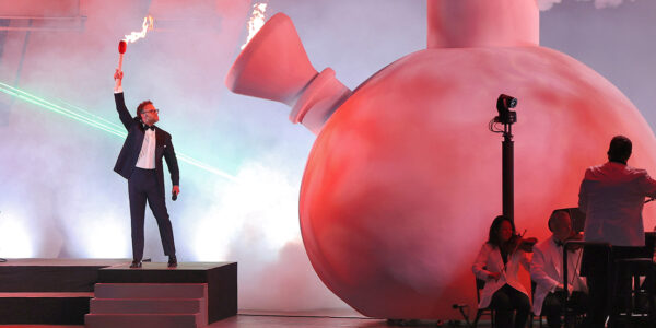 Сет Роген зажигает огромный бонг на шоу в Голливудской чаше, шутя: “Трава легальна, что я пытаюсь доказать?”